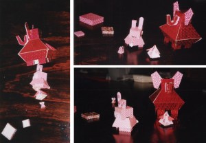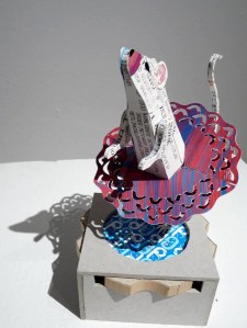 This piece didn’t get finished in time to make it into the BSG show. Will finish it in the next few weeks anyway. It is a 3D versions of a spinning / picture disk where, when spun, rats run out of holes and accros the page. Here the rats also grow wings and fly away. Will post a picture of the orginal with the finished work.