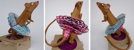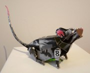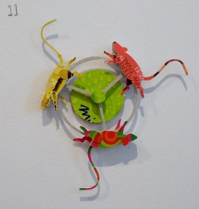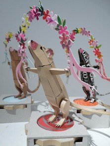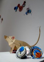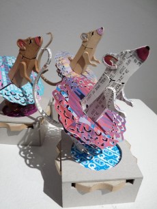 Subtitled ‘mice running wild in the hall of the cats‘ the show includes the felines and rodents I have been making. Most of the pieces are kinetic is some way or other (mice that fly and run in wheels, rats with wobble guts and cats with waving fists).