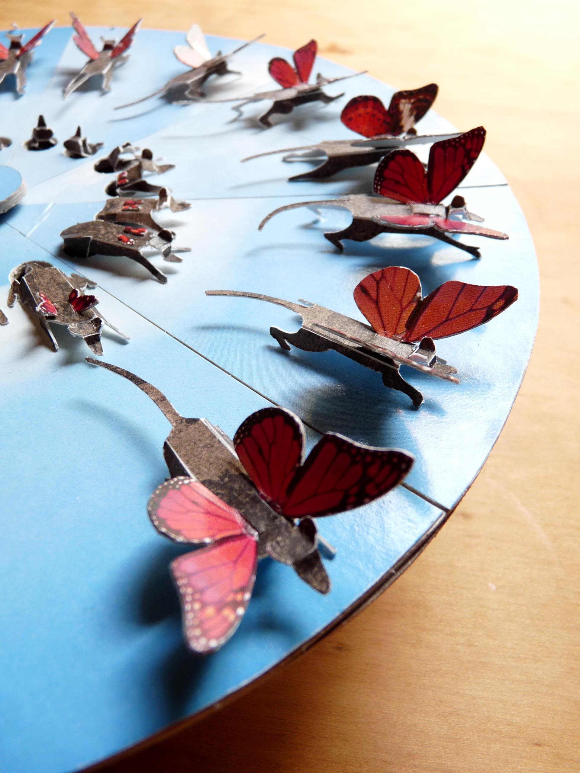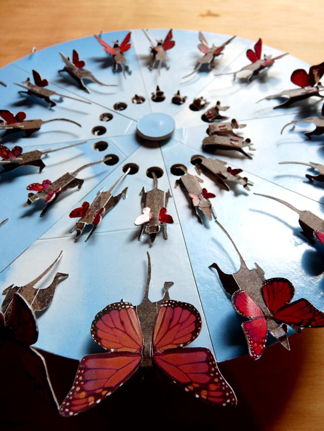 Here is a photo of the original picture disc by Thomas Mann Bayne for Joseph Plateau’s Phenakistiscope and my ‘Winged tribute‘ piece finished. The original picture disk is a part of the Werner Nekes collection which has all sorts of early illusion and animation pieces. The The images of the phenakistiscopes (picture disks) are located under ‘Gallery’ and then ‘Photos of the collection’.