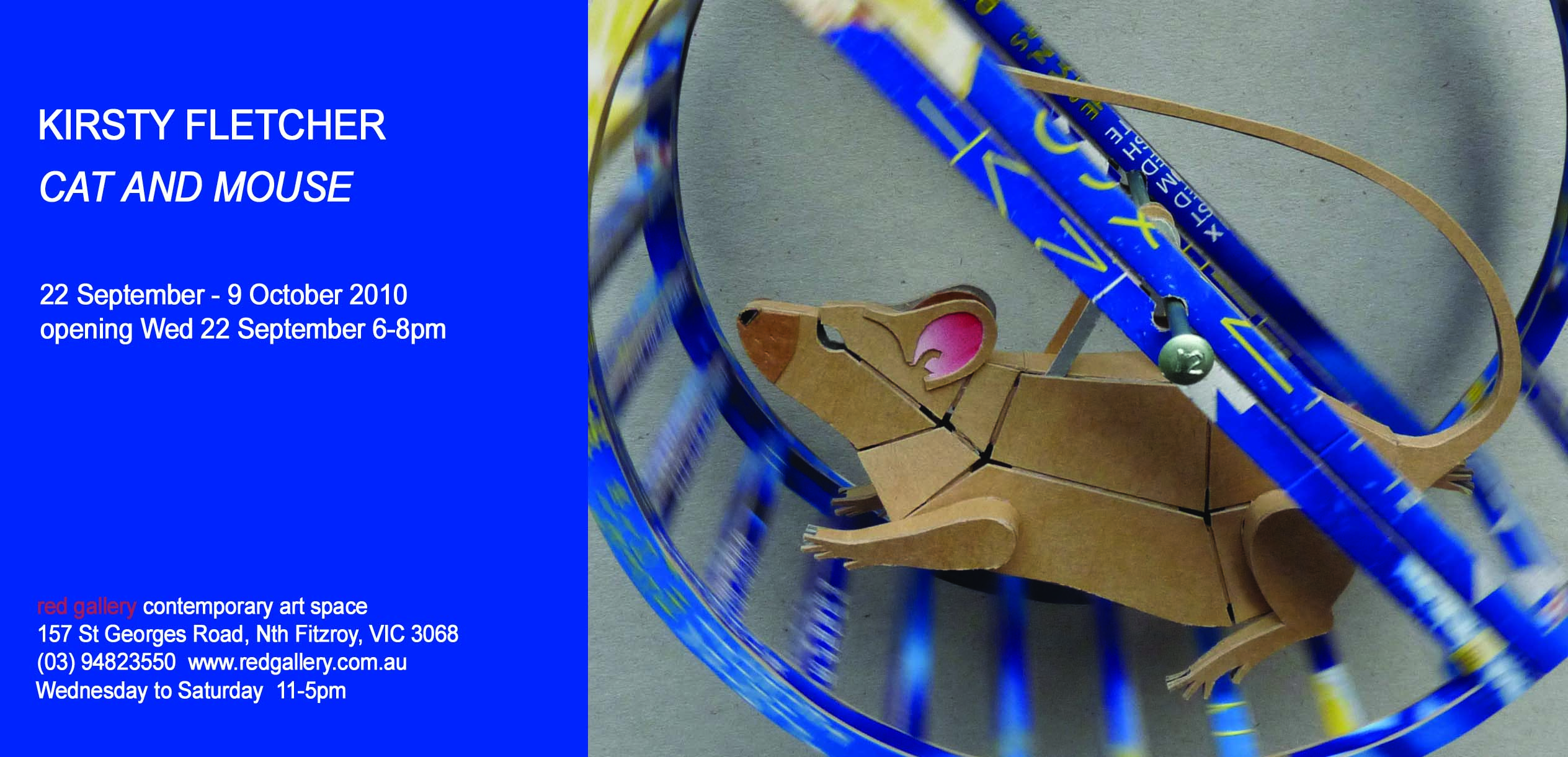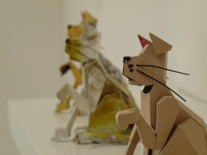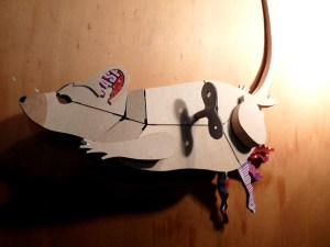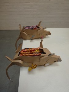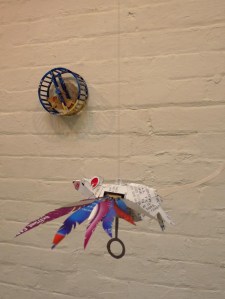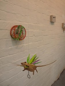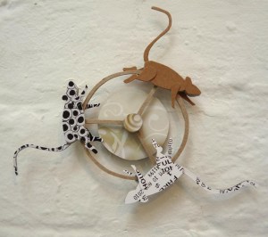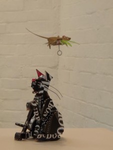 Subtitled ‘mice running wild in the hall of the cats‘ the show includes the felines and rodents I have been making. Most of the pieces are kinetic is some way or other (mice that fly and run in wheels, rats with wobble guts and cats with waving fists).