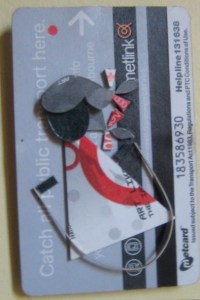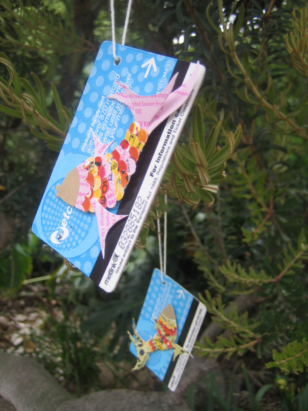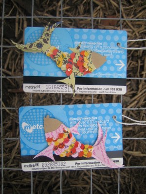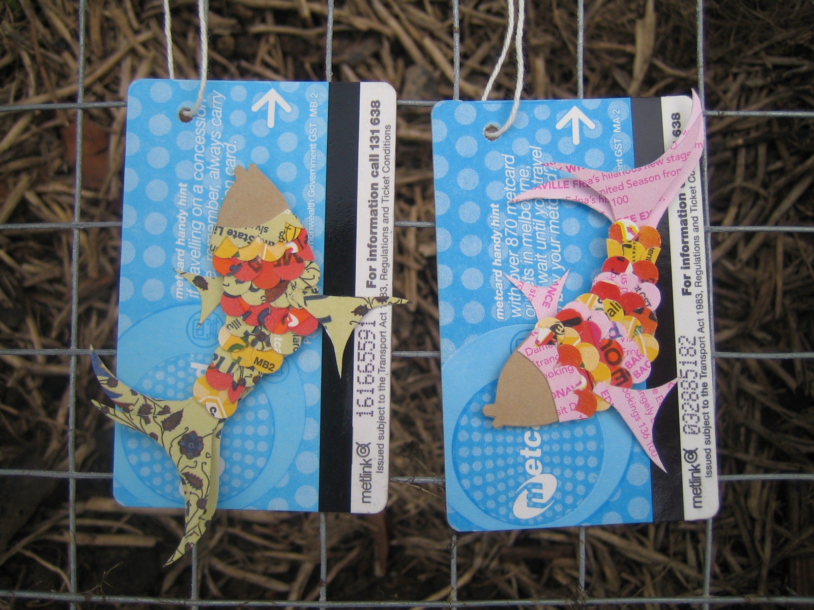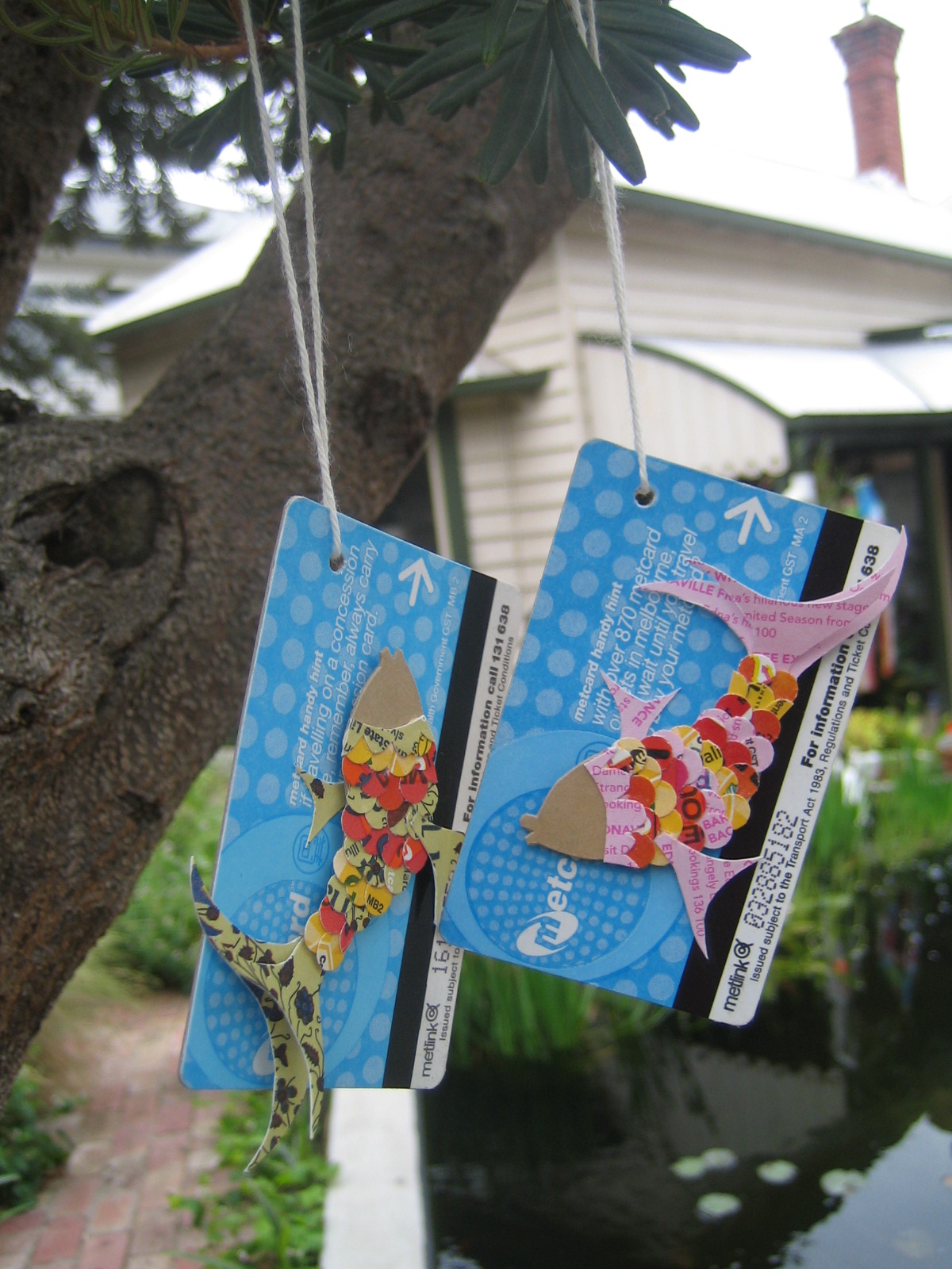 I have made a number of these fish mobiles. The first ones (including this one) are made out of tram tickets / metcards. The fish are suspended on salvaged street-sweeper blades found on the side of the street.