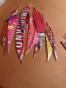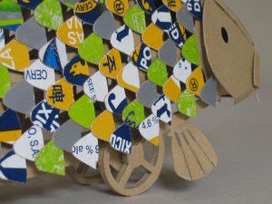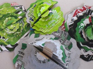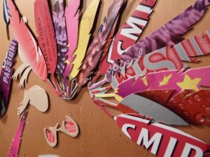 Brightly coloured alco-pop (and beer) packaging has been used for the tutus. The graphics are already designed to grab people’s attention and stand-out in the drinks fridge. The printed face has been used on the underside of the skirts where the multiple layers confuse and intensify the gaudy colours. It is all excitement and froth as the dancers kick their legs, jump and turn.