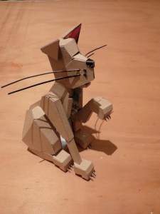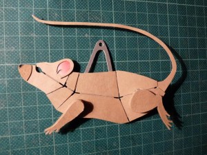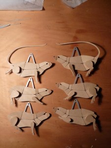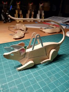 Subtitled ‘mice running wild in the hall of the cats‘ the show includes the felines and rodents I have been making. Most of the pieces are kinetic is some way or other (mice that fly and run in wheels, rats with wobble guts and cats with waving fists).